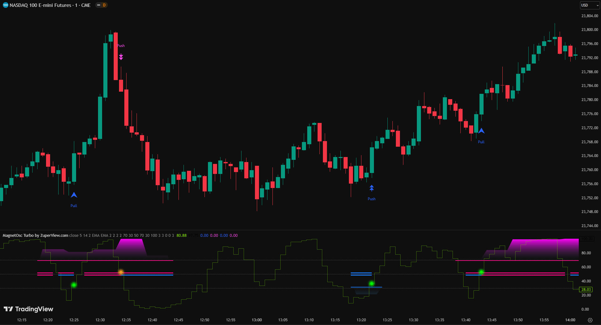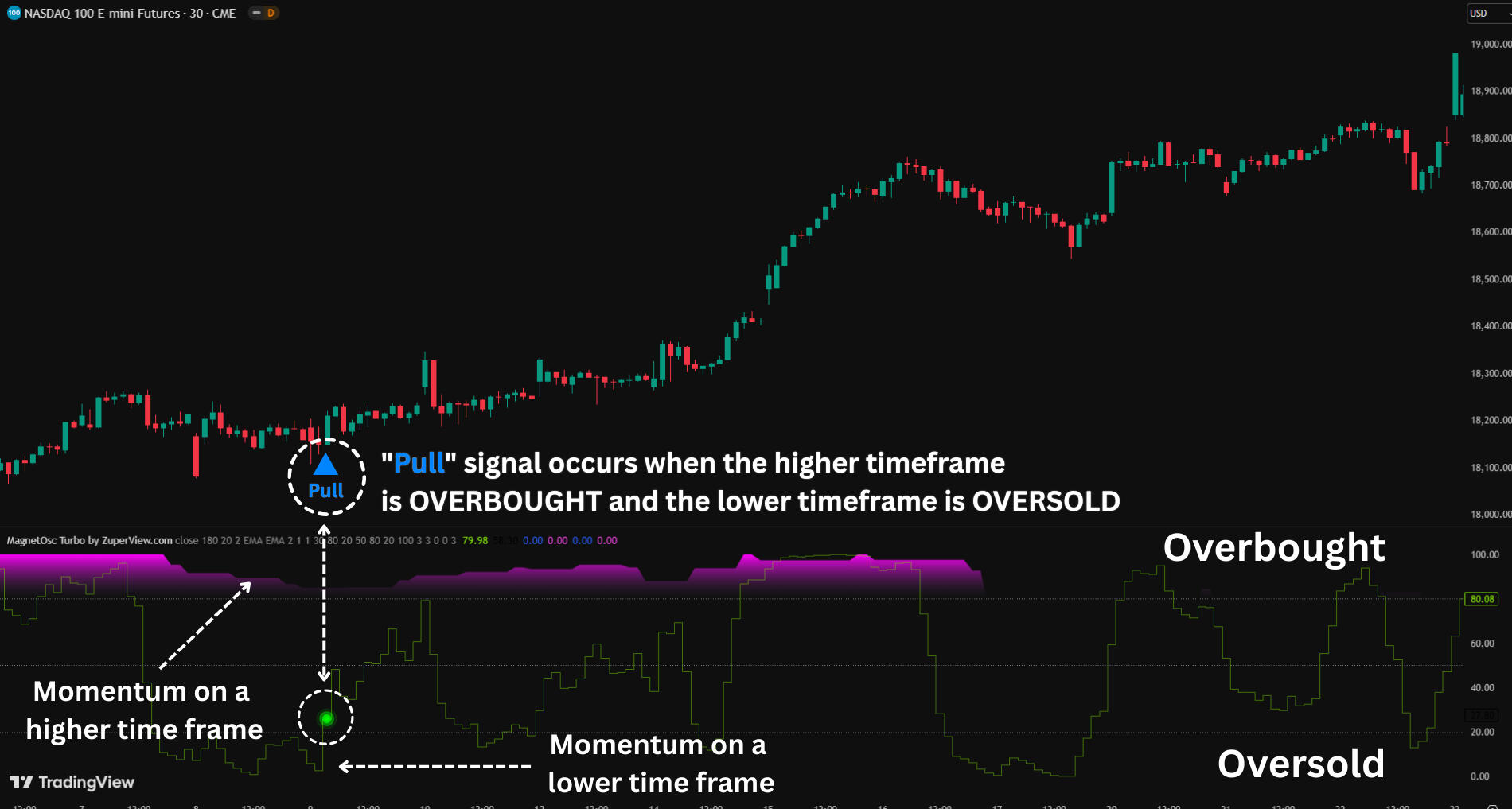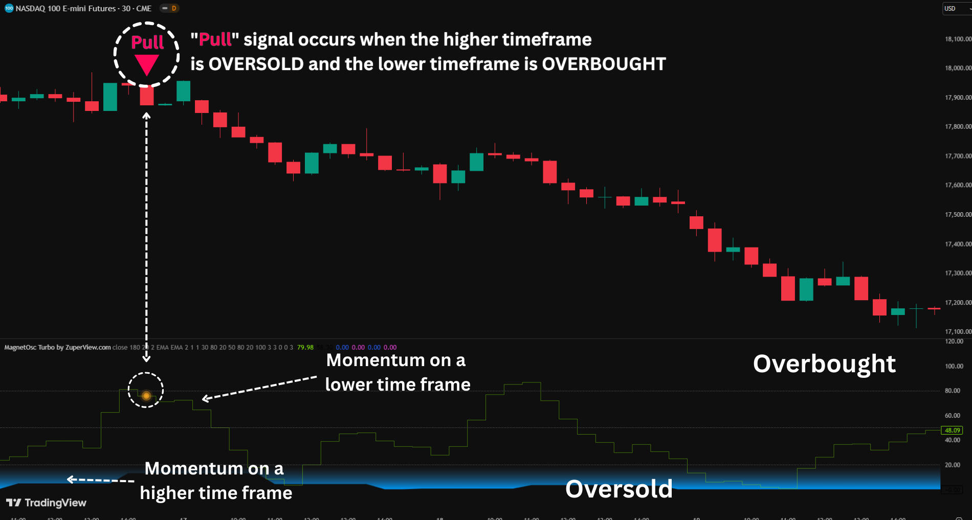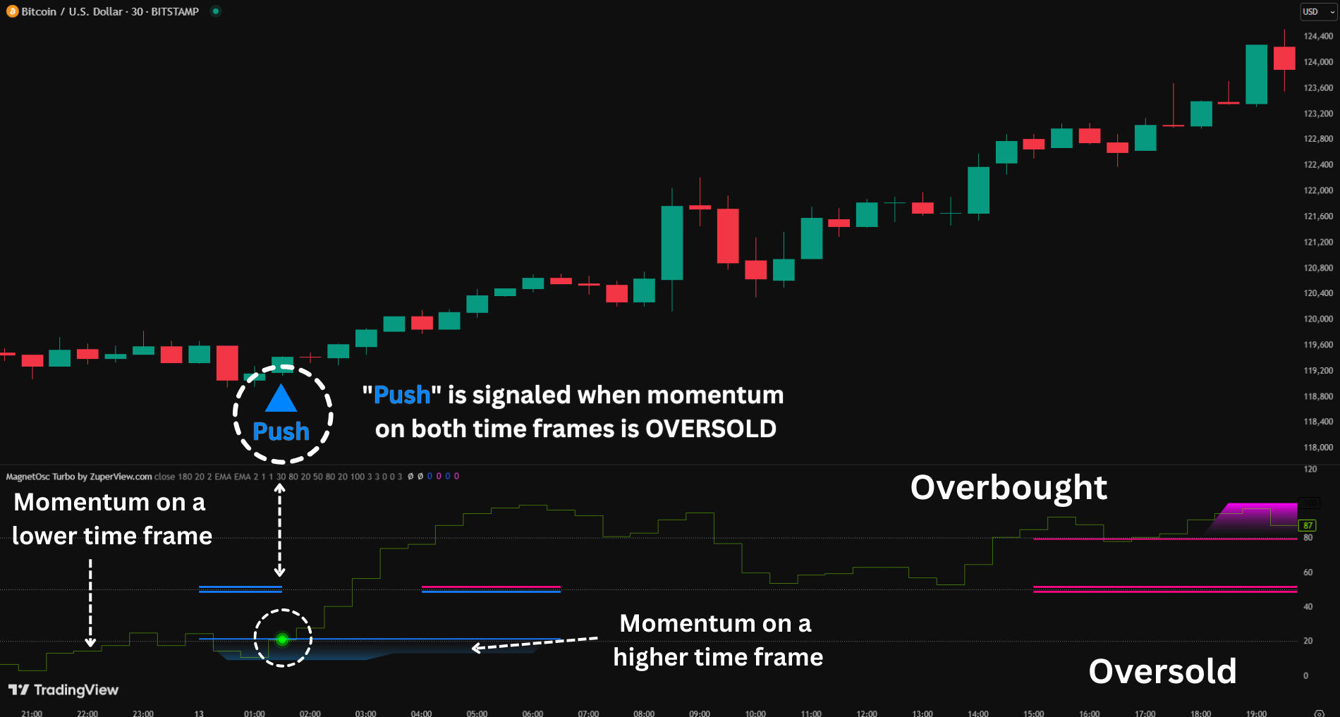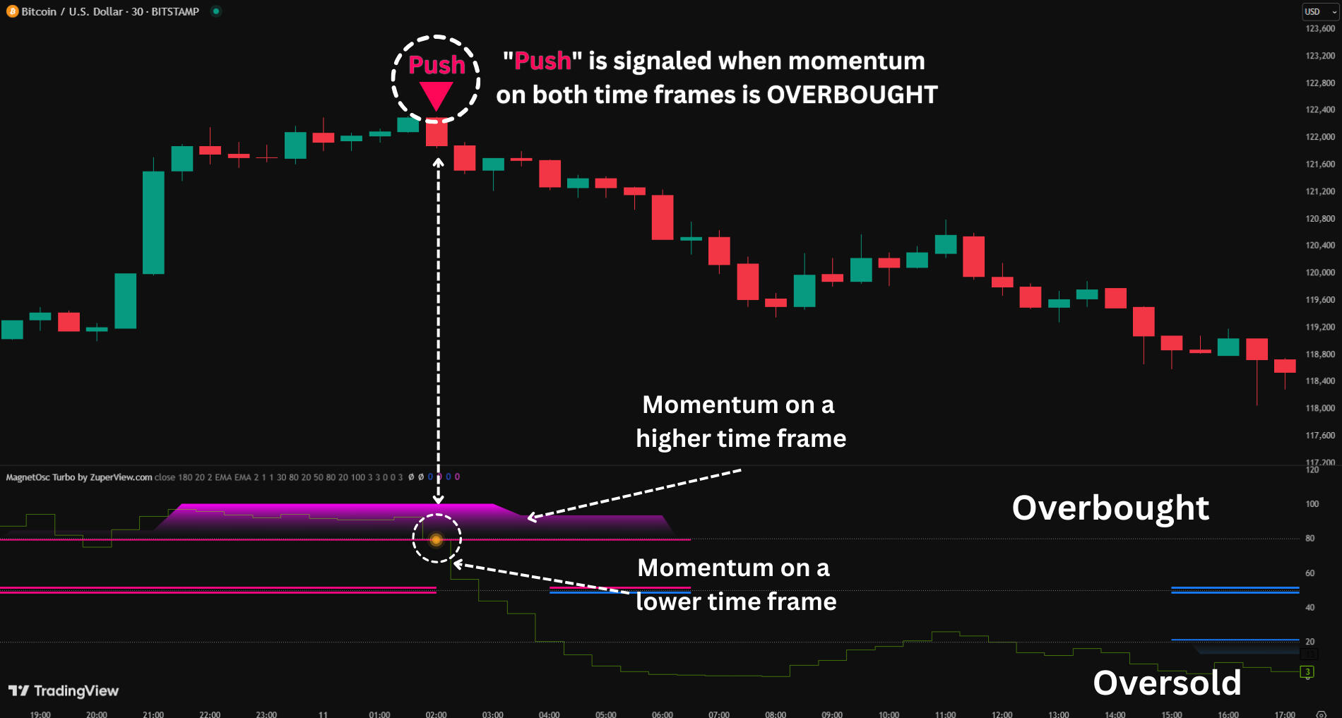 🟢 Pull (Opposite Poles)One timeframe is overbought, the other oversold.Momentum pulls in → Short-term reversal.Characteristics:🔸 More frequent signals.🔸 Usually smaller reversals, aligned with the larger timeframe.🔸Ideal for scalpers looking for quick opportunities..